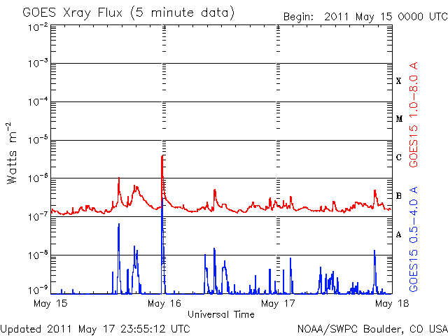 The operational data in the graph above has been modified to remove the scaling factor that has been applied by the Space Weather Prediction Center (SWPC). Because of the SWPC scaling factor in the operational data, flare indices for the operational data were reported as 42% smaller than for the science quality data. The scaling factor has also been removed from the solar flare list to reflect the true physical units.