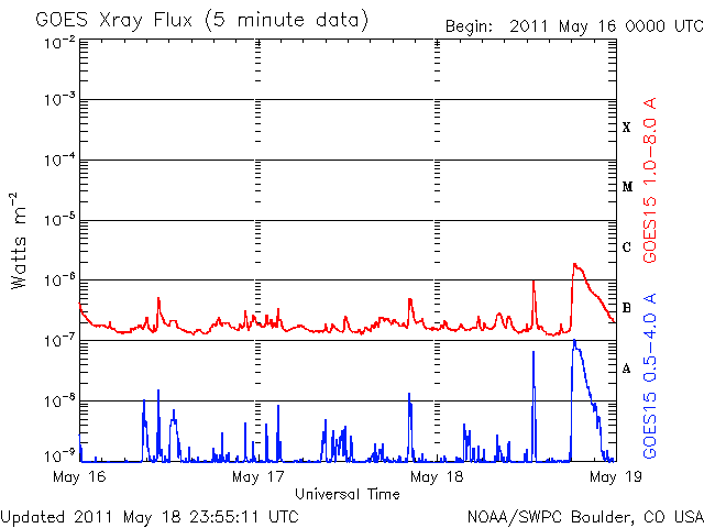 The operational data in the graph above has been modified to remove the scaling factor that has been applied by the Space Weather Prediction Center (SWPC). Because of the SWPC scaling factor in the operational data, flare indices for the operational data were reported as 42% smaller than for the science quality data. The scaling factor has also been removed from the solar flare list to reflect the true physical units.