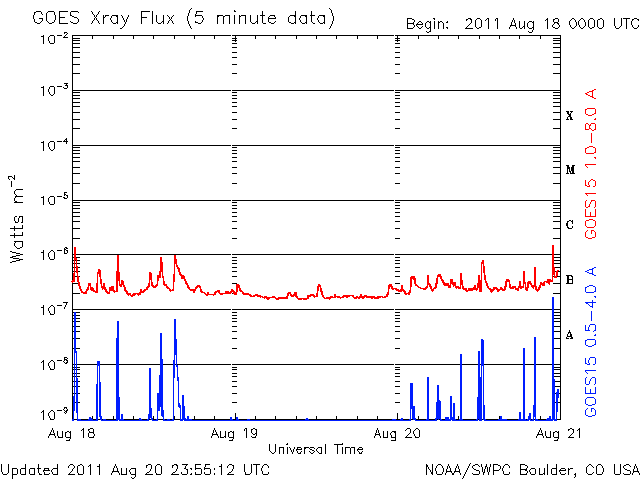 The operational data in the graph above has been modified to remove the scaling factor that has been applied by the Space Weather Prediction Center (SWPC). Because of the SWPC scaling factor in the operational data, flare indices for the operational data were reported as 42% smaller than for the science quality data. The scaling factor has also been removed from the solar flare list to reflect the true physical units.