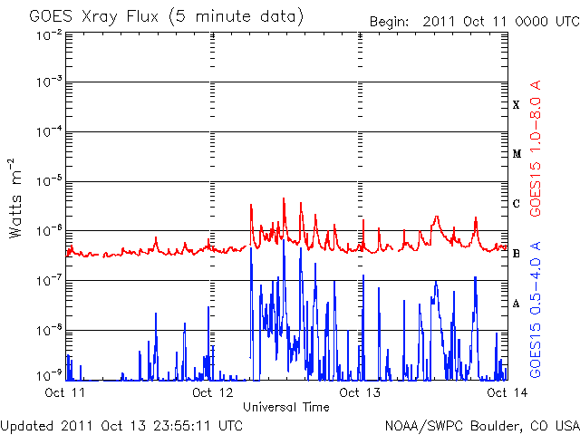 The operational data in the graph above has been modified to remove the scaling factor that has been applied by the Space Weather Prediction Center (SWPC). Because of the SWPC scaling factor in the operational data, flare indices for the operational data were reported as 42% smaller than for the science quality data. The scaling factor has also been removed from the solar flare list to reflect the true physical units.