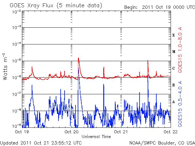 The operational data in the graph above has been modified to remove the scaling factor that has been applied by the Space Weather Prediction Center (SWPC). Because of the SWPC scaling factor in the operational data, flare indices for the operational data were reported as 42% smaller than for the science quality data. The scaling factor has also been removed from the solar flare list to reflect the true physical units.