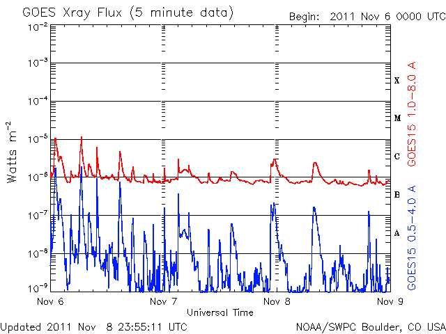 The operational data in the graph above has been modified to remove the scaling factor that has been applied by the Space Weather Prediction Center (SWPC). Because of the SWPC scaling factor in the operational data, flare indices for the operational data were reported as 42% smaller than for the science quality data. The scaling factor has also been removed from the solar flare list to reflect the true physical units.