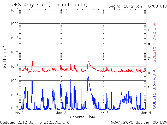 The operational data in the graph above has been modified to remove the scaling factor that has been applied by the Space Weather Prediction Center (SWPC). Because of the SWPC scaling factor in the operational data, flare indices for the operational data were reported as 42% smaller than for the science quality data. The scaling factor has also been removed from the solar flare list to reflect the true physical units.