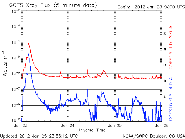 The operational data in the graph above has been modified to remove the scaling factor that has been applied by the Space Weather Prediction Center (SWPC). Because of the SWPC scaling factor in the operational data, flare indices for the operational data were reported as 42% smaller than for the science quality data. The scaling factor has also been removed from the solar flare list to reflect the true physical units.