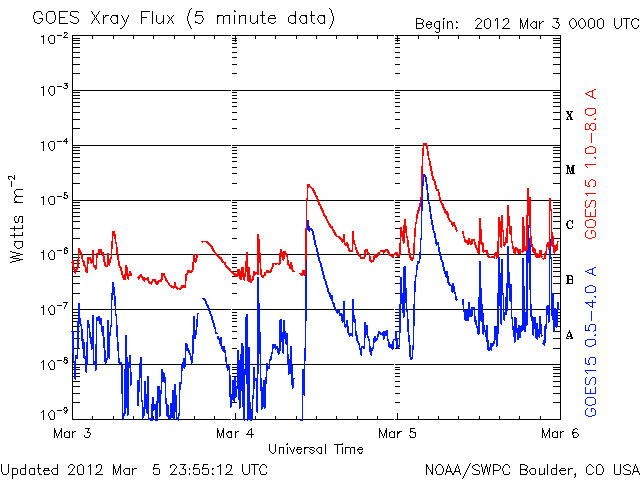 The operational data in the graph above has been modified to remove the scaling factor that has been applied by the Space Weather Prediction Center (SWPC). Because of the SWPC scaling factor in the operational data, flare indices for the operational data were reported as 42% smaller than for the science quality data. The scaling factor has also been removed from the solar flare list to reflect the true physical units.