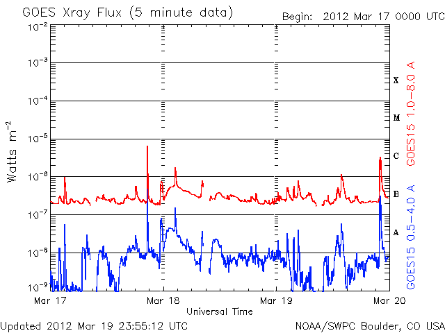 The operational data in the graph above has been modified to remove the scaling factor that has been applied by the Space Weather Prediction Center (SWPC). Because of the SWPC scaling factor in the operational data, flare indices for the operational data were reported as 42% smaller than for the science quality data. The scaling factor has also been removed from the solar flare list to reflect the true physical units.