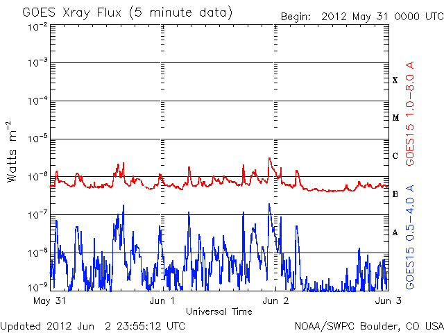 The operational data in the graph above has been modified to remove the scaling factor that has been applied by the Space Weather Prediction Center (SWPC). Because of the SWPC scaling factor in the operational data, flare indices for the operational data were reported as 42% smaller than for the science quality data. The scaling factor has also been removed from the solar flare list to reflect the true physical units.