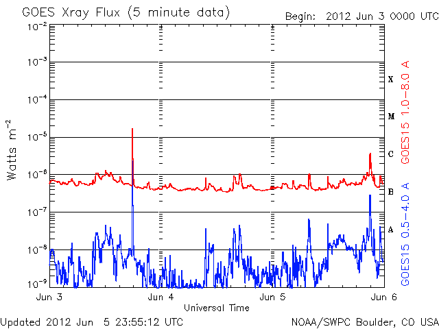 The operational data in the graph above has been modified to remove the scaling factor that has been applied by the Space Weather Prediction Center (SWPC). Because of the SWPC scaling factor in the operational data, flare indices for the operational data were reported as 42% smaller than for the science quality data. The scaling factor has also been removed from the solar flare list to reflect the true physical units.
