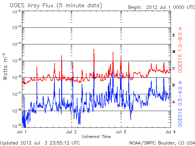 The operational data in the graph above has been modified to remove the scaling factor that has been applied by the Space Weather Prediction Center (SWPC). Because of the SWPC scaling factor in the operational data, flare indices for the operational data were reported as 42% smaller than for the science quality data. The scaling factor has also been removed from the solar flare list to reflect the true physical units.