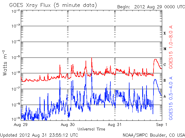The operational data in the graph above has been modified to remove the scaling factor that has been applied by the Space Weather Prediction Center (SWPC). Because of the SWPC scaling factor in the operational data, flare indices for the operational data were reported as 42% smaller than for the science quality data. The scaling factor has also been removed from the solar flare list to reflect the true physical units.