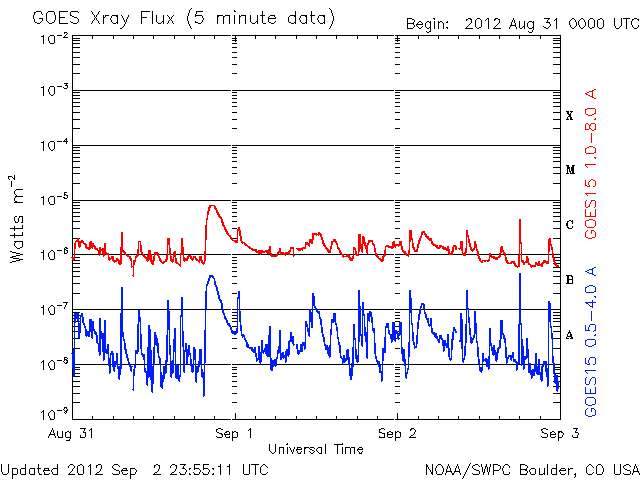 The operational data in the graph above has been modified to remove the scaling factor that has been applied by the Space Weather Prediction Center (SWPC). Because of the SWPC scaling factor in the operational data, flare indices for the operational data were reported as 42% smaller than for the science quality data. The scaling factor has also been removed from the solar flare list to reflect the true physical units.