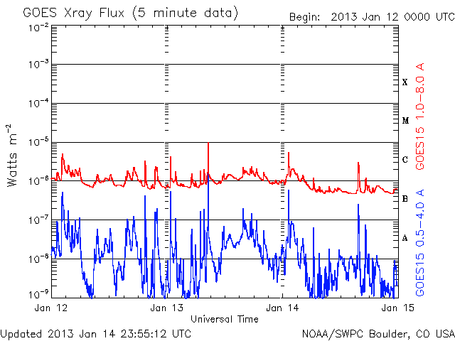 The operational data in the graph above has been modified to remove the scaling factor that has been applied by the Space Weather Prediction Center (SWPC). Because of the SWPC scaling factor in the operational data, flare indices for the operational data were reported as 42% smaller than for the science quality data. The scaling factor has also been removed from the solar flare list to reflect the true physical units.