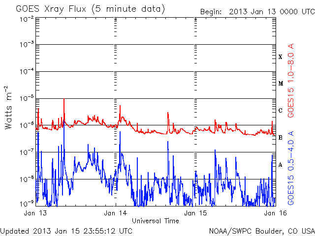 The operational data in the graph above has been modified to remove the scaling factor that has been applied by the Space Weather Prediction Center (SWPC). Because of the SWPC scaling factor in the operational data, flare indices for the operational data were reported as 42% smaller than for the science quality data. The scaling factor has also been removed from the solar flare list to reflect the true physical units.