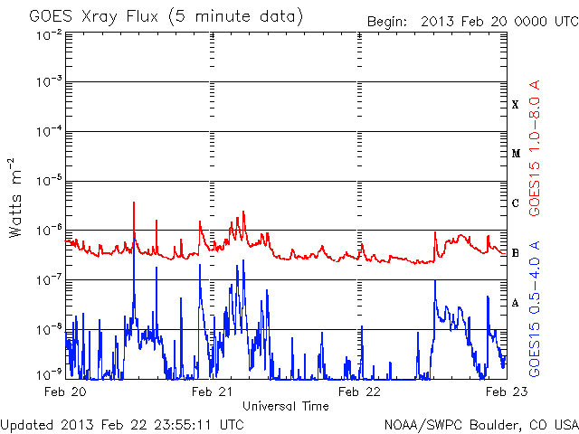 The operational data in the graph above has been modified to remove the scaling factor that has been applied by the Space Weather Prediction Center (SWPC). Because of the SWPC scaling factor in the operational data, flare indices for the operational data were reported as 42% smaller than for the science quality data. The scaling factor has also been removed from the solar flare list to reflect the true physical units.