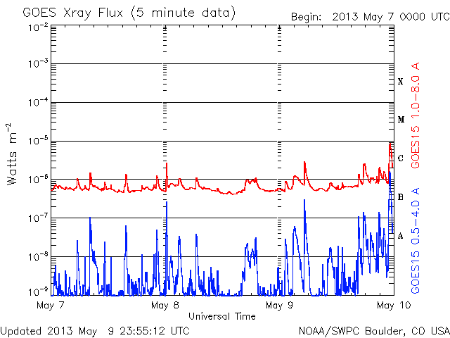 The operational data in the graph above has been modified to remove the scaling factor that has been applied by the Space Weather Prediction Center (SWPC). Because of the SWPC scaling factor in the operational data, flare indices for the operational data were reported as 42% smaller than for the science quality data. The scaling factor has also been removed from the solar flare list to reflect the true physical units.
