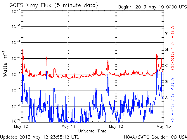 The operational data in the graph above has been modified to remove the scaling factor that has been applied by the Space Weather Prediction Center (SWPC). Because of the SWPC scaling factor in the operational data, flare indices for the operational data were reported as 42% smaller than for the science quality data. The scaling factor has also been removed from the solar flare list to reflect the true physical units.