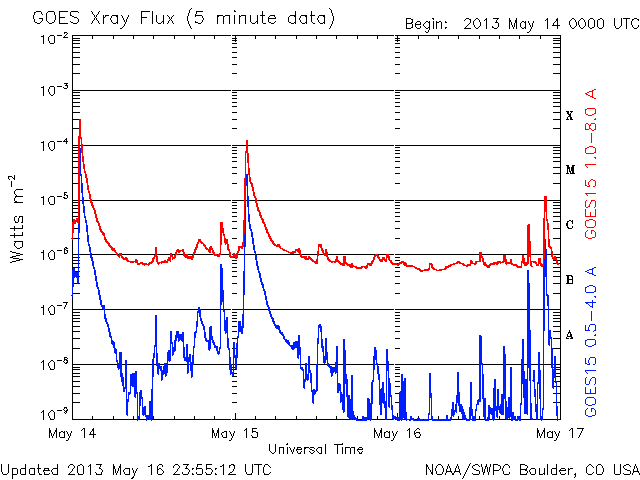 The operational data in the graph above has been modified to remove the scaling factor that has been applied by the Space Weather Prediction Center (SWPC). Because of the SWPC scaling factor in the operational data, flare indices for the operational data were reported as 42% smaller than for the science quality data. The scaling factor has also been removed from the solar flare list to reflect the true physical units.