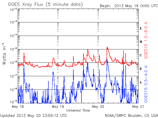 The operational data in the graph above has been modified to remove the scaling factor that has been applied by the Space Weather Prediction Center (SWPC). Because of the SWPC scaling factor in the operational data, flare indices for the operational data were reported as 42% smaller than for the science quality data. The scaling factor has also been removed from the solar flare list to reflect the true physical units.