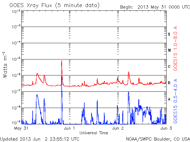 The operational data in the graph above has been modified to remove the scaling factor that has been applied by the Space Weather Prediction Center (SWPC). Because of the SWPC scaling factor in the operational data, flare indices for the operational data were reported as 42% smaller than for the science quality data. The scaling factor has also been removed from the solar flare list to reflect the true physical units.