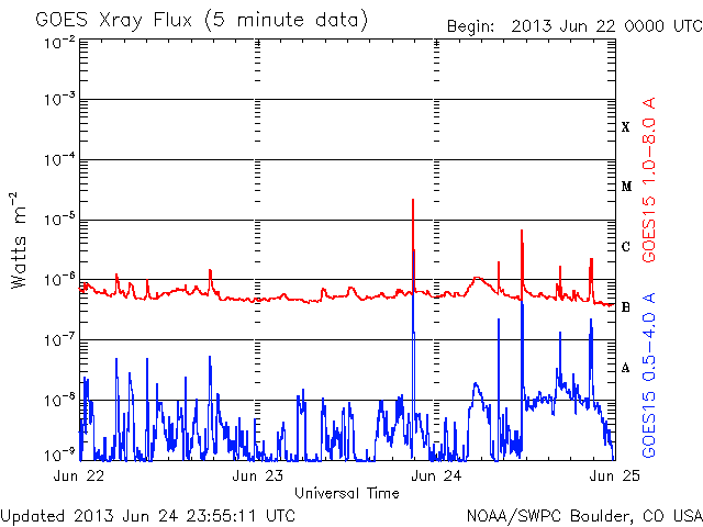 The operational data in the graph above has been modified to remove the scaling factor that has been applied by the Space Weather Prediction Center (SWPC). Because of the SWPC scaling factor in the operational data, flare indices for the operational data were reported as 42% smaller than for the science quality data. The scaling factor has also been removed from the solar flare list to reflect the true physical units.
