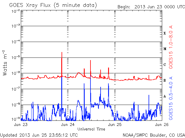 The operational data in the graph above has been modified to remove the scaling factor that has been applied by the Space Weather Prediction Center (SWPC). Because of the SWPC scaling factor in the operational data, flare indices for the operational data were reported as 42% smaller than for the science quality data. The scaling factor has also been removed from the solar flare list to reflect the true physical units.