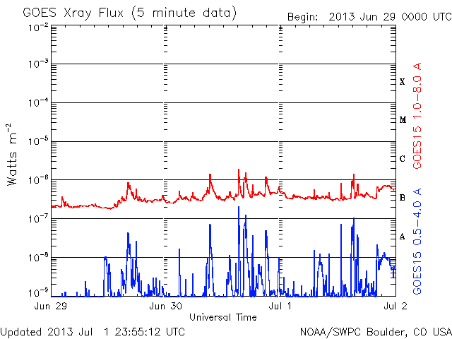 The operational data in the graph above has been modified to remove the scaling factor that has been applied by the Space Weather Prediction Center (SWPC). Because of the SWPC scaling factor in the operational data, flare indices for the operational data were reported as 42% smaller than for the science quality data. The scaling factor has also been removed from the solar flare list to reflect the true physical units.