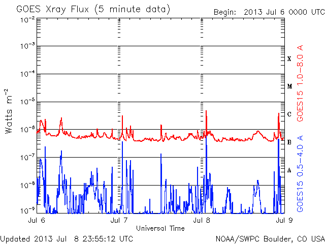 The operational data in the graph above has been modified to remove the scaling factor that has been applied by the Space Weather Prediction Center (SWPC). Because of the SWPC scaling factor in the operational data, flare indices for the operational data were reported as 42% smaller than for the science quality data. The scaling factor has also been removed from the solar flare list to reflect the true physical units.
