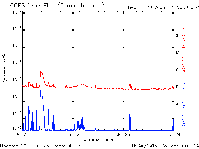 The operational data in the graph above has been modified to remove the scaling factor that has been applied by the Space Weather Prediction Center (SWPC). Because of the SWPC scaling factor in the operational data, flare indices for the operational data were reported as 42% smaller than for the science quality data. The scaling factor has also been removed from the solar flare list to reflect the true physical units.