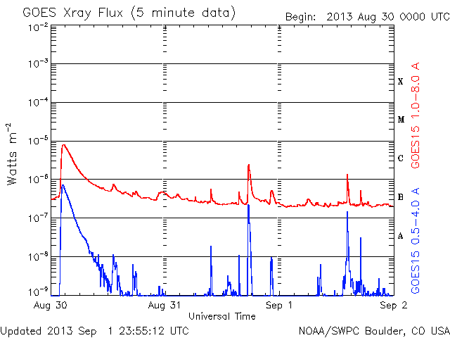 The operational data in the graph above has been modified to remove the scaling factor that has been applied by the Space Weather Prediction Center (SWPC). Because of the SWPC scaling factor in the operational data, flare indices for the operational data were reported as 42% smaller than for the science quality data. The scaling factor has also been removed from the solar flare list to reflect the true physical units.