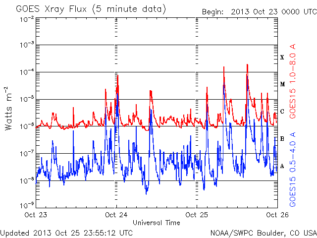 The operational data in the graph above has been modified to remove the scaling factor that has been applied by the Space Weather Prediction Center (SWPC). Because of the SWPC scaling factor in the operational data, flare indices for the operational data were reported as 42% smaller than for the science quality data. The scaling factor has also been removed from the solar flare list to reflect the true physical units.
