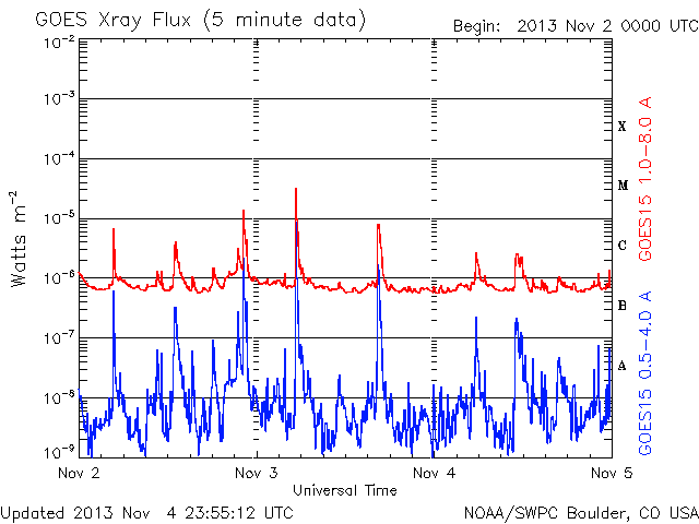 The operational data in the graph above has been modified to remove the scaling factor that has been applied by the Space Weather Prediction Center (SWPC). Because of the SWPC scaling factor in the operational data, flare indices for the operational data were reported as 42% smaller than for the science quality data. The scaling factor has also been removed from the solar flare list to reflect the true physical units.