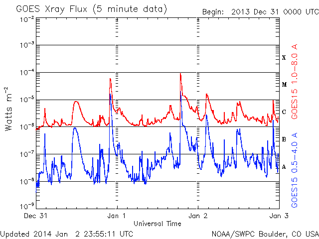 The operational data in the graph above has been modified to remove the scaling factor that has been applied by the Space Weather Prediction Center (SWPC). Because of the SWPC scaling factor in the operational data, flare indices for the operational data were reported as 42% smaller than for the science quality data. The scaling factor has also been removed from the solar flare list to reflect the true physical units.