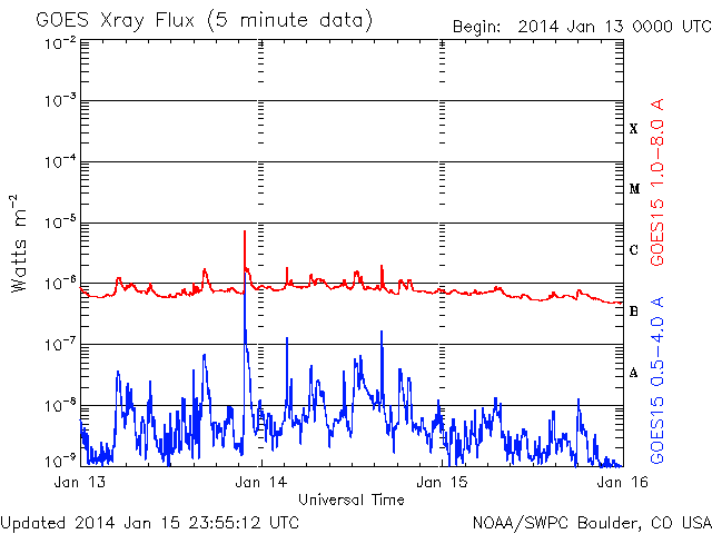 The operational data in the graph above has been modified to remove the scaling factor that has been applied by the Space Weather Prediction Center (SWPC). Because of the SWPC scaling factor in the operational data, flare indices for the operational data were reported as 42% smaller than for the science quality data. The scaling factor has also been removed from the solar flare list to reflect the true physical units.