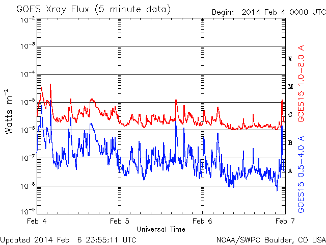 The operational data in the graph above has been modified to remove the scaling factor that has been applied by the Space Weather Prediction Center (SWPC). Because of the SWPC scaling factor in the operational data, flare indices for the operational data were reported as 42% smaller than for the science quality data. The scaling factor has also been removed from the solar flare list to reflect the true physical units.