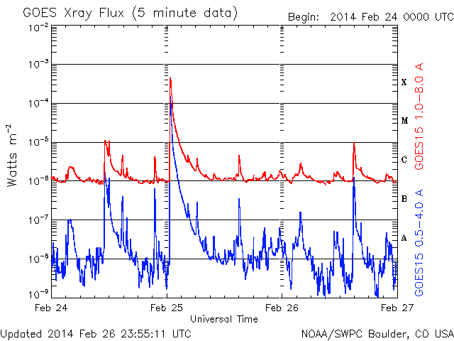 The operational data in the graph above has been modified to remove the scaling factor that has been applied by the Space Weather Prediction Center (SWPC). Because of the SWPC scaling factor in the operational data, flare indices for the operational data were reported as 42% smaller than for the science quality data. The scaling factor has also been removed from the solar flare list to reflect the true physical units.