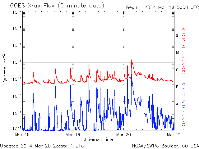 The operational data in the graph above has been modified to remove the scaling factor that has been applied by the Space Weather Prediction Center (SWPC). Because of the SWPC scaling factor in the operational data, flare indices for the operational data were reported as 42% smaller than for the science quality data. The scaling factor has also been removed from the solar flare list to reflect the true physical units.