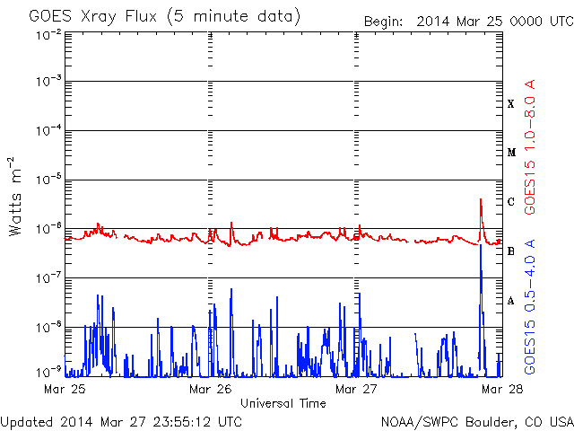 The operational data in the graph above has been modified to remove the scaling factor that has been applied by the Space Weather Prediction Center (SWPC). Because of the SWPC scaling factor in the operational data, flare indices for the operational data were reported as 42% smaller than for the science quality data. The scaling factor has also been removed from the solar flare list to reflect the true physical units.