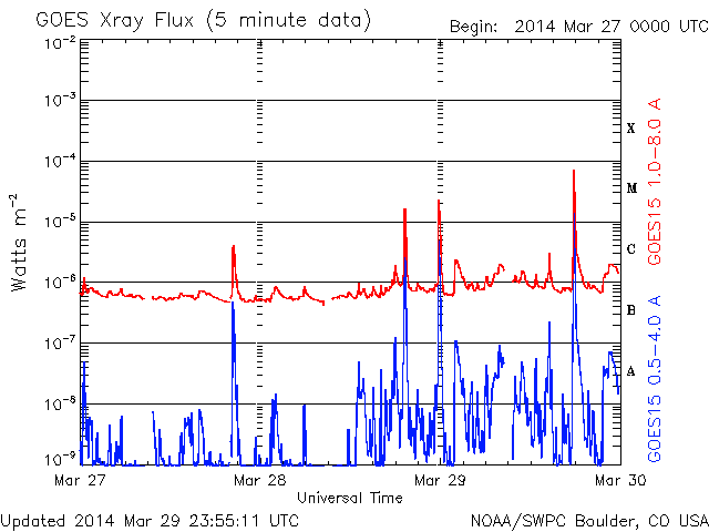 The operational data in the graph above has been modified to remove the scaling factor that has been applied by the Space Weather Prediction Center (SWPC). Because of the SWPC scaling factor in the operational data, flare indices for the operational data were reported as 42% smaller than for the science quality data. The scaling factor has also been removed from the solar flare list to reflect the true physical units.