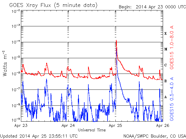 The operational data in the graph above has been modified to remove the scaling factor that has been applied by the Space Weather Prediction Center (SWPC). Because of the SWPC scaling factor in the operational data, flare indices for the operational data were reported as 42% smaller than for the science quality data. The scaling factor has also been removed from the solar flare list to reflect the true physical units.