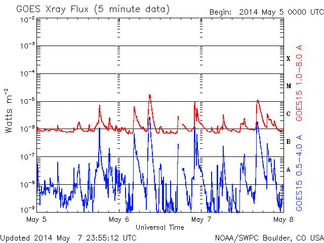 The operational data in the graph above has been modified to remove the scaling factor that has been applied by the Space Weather Prediction Center (SWPC). Because of the SWPC scaling factor in the operational data, flare indices for the operational data were reported as 42% smaller than for the science quality data. The scaling factor has also been removed from the solar flare list to reflect the true physical units.