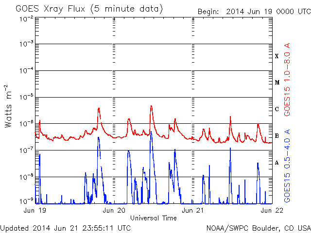 The operational data in the graph above has been modified to remove the scaling factor that has been applied by the Space Weather Prediction Center (SWPC). Because of the SWPC scaling factor in the operational data, flare indices for the operational data were reported as 42% smaller than for the science quality data. The scaling factor has also been removed from the solar flare list to reflect the true physical units.