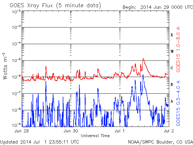 The operational data in the graph above has been modified to remove the scaling factor that has been applied by the Space Weather Prediction Center (SWPC). Because of the SWPC scaling factor in the operational data, flare indices for the operational data were reported as 42% smaller than for the science quality data. The scaling factor has also been removed from the solar flare list to reflect the true physical units.