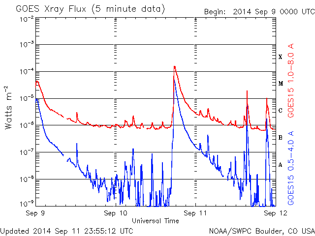 The operational data in the graph above has been modified to remove the scaling factor that has been applied by the Space Weather Prediction Center (SWPC). Because of the SWPC scaling factor in the operational data, flare indices for the operational data were reported as 42% smaller than for the science quality data. The scaling factor has also been removed from the solar flare list to reflect the true physical units.