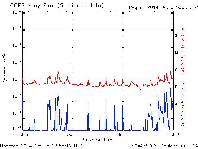 The operational data in the graph above has been modified to remove the scaling factor that has been applied by the Space Weather Prediction Center (SWPC). Because of the SWPC scaling factor in the operational data, flare indices for the operational data were reported as 42% smaller than for the science quality data. The scaling factor has also been removed from the solar flare list to reflect the true physical units.