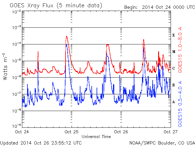 The operational data in the graph above has been modified to remove the scaling factor that has been applied by the Space Weather Prediction Center (SWPC). Because of the SWPC scaling factor in the operational data, flare indices for the operational data were reported as 42% smaller than for the science quality data. The scaling factor has also been removed from the solar flare list to reflect the true physical units.