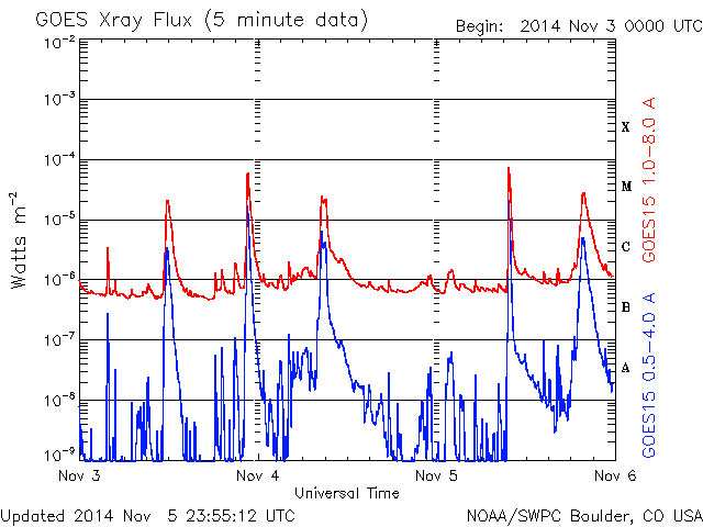 The operational data in the graph above has been modified to remove the scaling factor that has been applied by the Space Weather Prediction Center (SWPC). Because of the SWPC scaling factor in the operational data, flare indices for the operational data were reported as 42% smaller than for the science quality data. The scaling factor has also been removed from the solar flare list to reflect the true physical units.