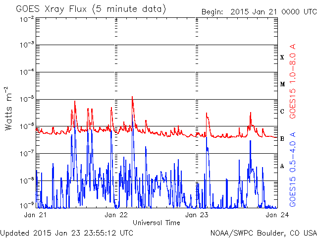 The operational data in the graph above has been modified to remove the scaling factor that has been applied by the Space Weather Prediction Center (SWPC). Because of the SWPC scaling factor in the operational data, flare indices for the operational data were reported as 42% smaller than for the science quality data. The scaling factor has also been removed from the solar flare list to reflect the true physical units.