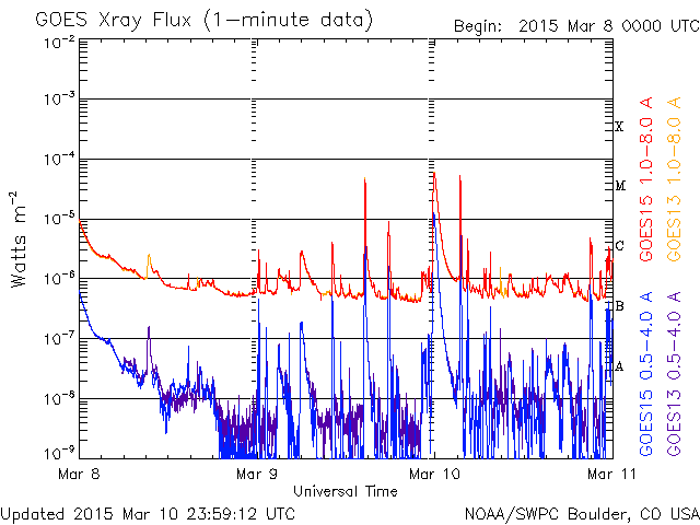 The operational data in the graph above has been modified to remove the scaling factor that has been applied by the Space Weather Prediction Center (SWPC). Because of the SWPC scaling factor in the operational data, flare indices for the operational data were reported as 42% smaller than for the science quality data. The scaling factor has also been removed from the solar flare list to reflect the true physical units.