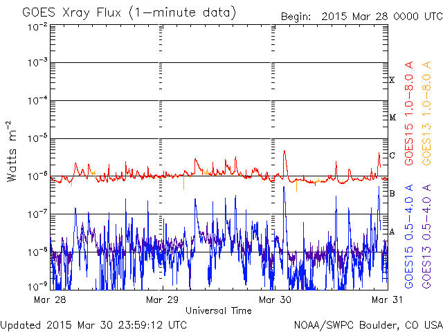 The operational data in the graph above has been modified to remove the scaling factor that has been applied by the Space Weather Prediction Center (SWPC). Because of the SWPC scaling factor in the operational data, flare indices for the operational data were reported as 42% smaller than for the science quality data. The scaling factor has also been removed from the solar flare list to reflect the true physical units.