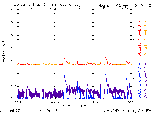 The operational data in the graph above has been modified to remove the scaling factor that has been applied by the Space Weather Prediction Center (SWPC). Because of the SWPC scaling factor in the operational data, flare indices for the operational data were reported as 42% smaller than for the science quality data. The scaling factor has also been removed from the solar flare list to reflect the true physical units.